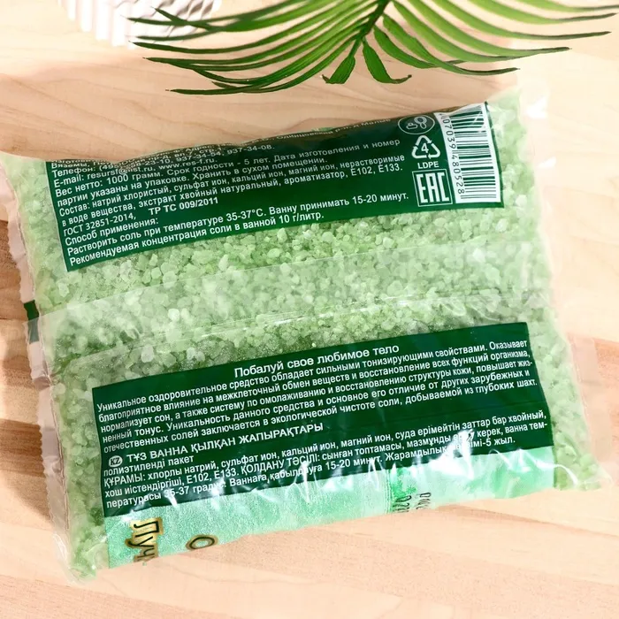 Состав: натрий хлористый, сульфат ион, калий ион, магний ион, нерастворимые в воде вещества, экстракт хвои, Е133.
