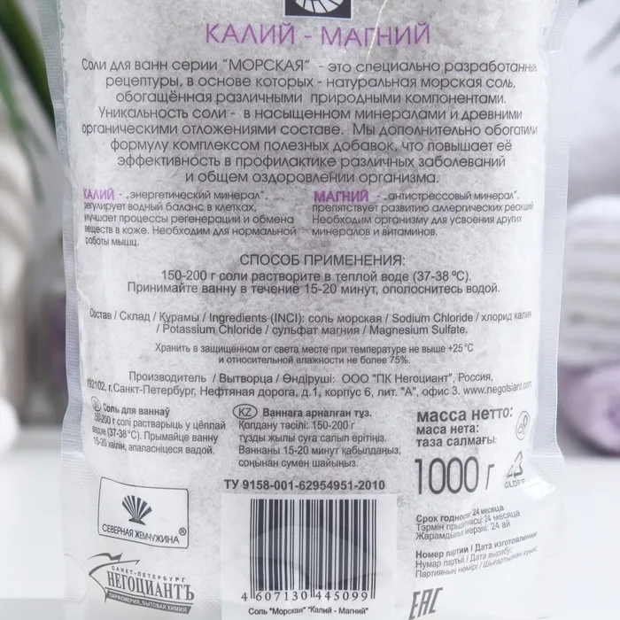 Соль для ванн Северная жемчужина «Морская», калий-магний, 1000 г — Характеристики
