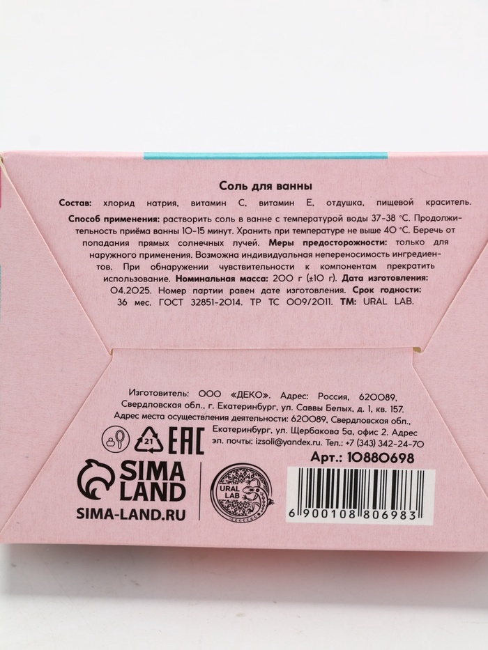 Соль для ванны, 200 г, аромат мятное мороженое, URAL LAB — Характеристики
