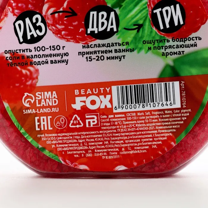 Соль для ванны, 350 г, аромат малины, BEAUTY FOOD — Характеристики