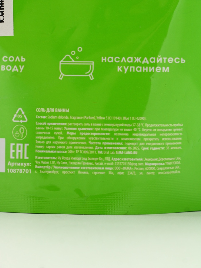 Состав: Sodium chloride, Fragrance (Parfum), Yellow 5(CI 19140), Blue 1(CI 42090).