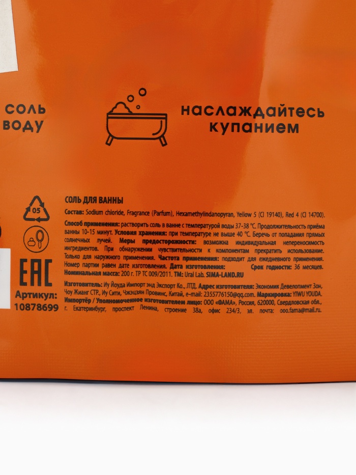 Состав: Sodium chloride, Fragrance (Parfum), Hexamethylindanopyran, Yellow 5(CI 19140), Red 4(CI 14700).