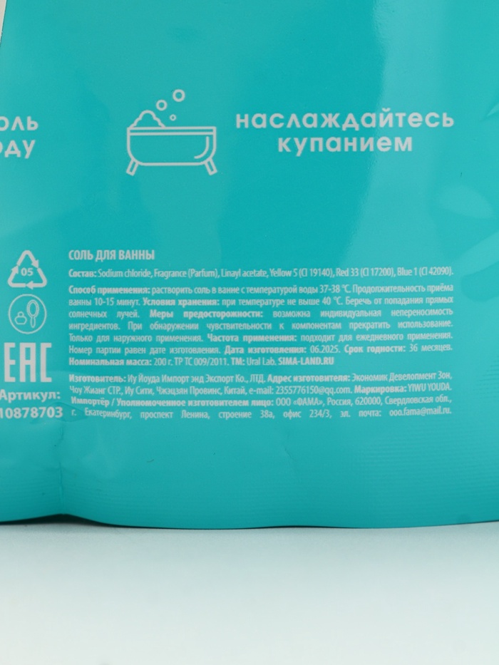 Состав: Sodium chloride, Fragrance (Parfum), Linayl acetate, Yellow 5(CI 19140), Red 33(CI 17200), Blue 1(CI 42090).