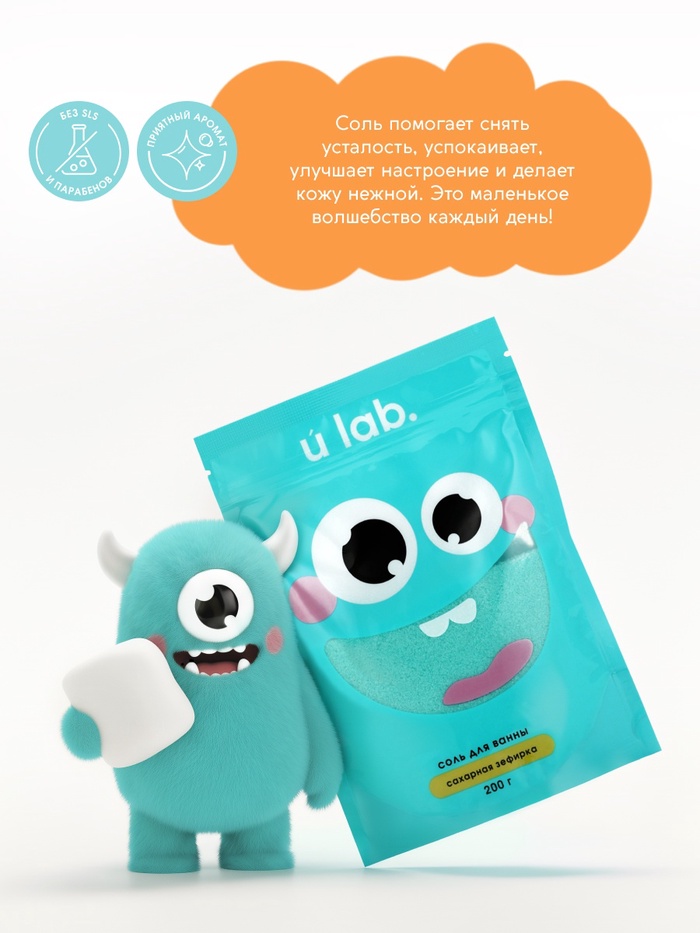 Соль для ванны «Монстрики», 200 г, аромат сахарная зефирка, ULAB — Характеристики