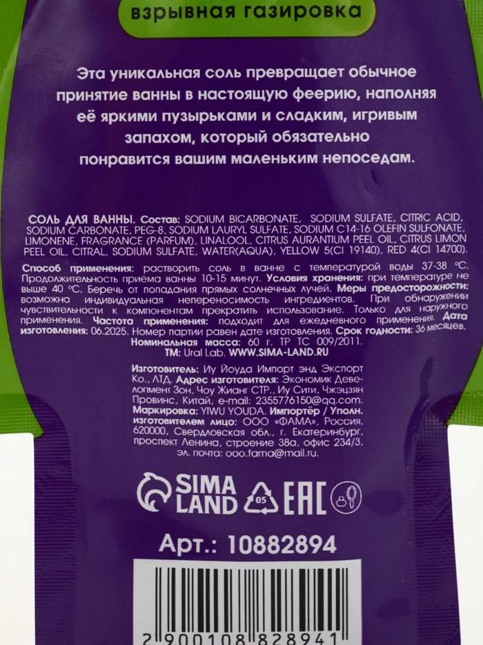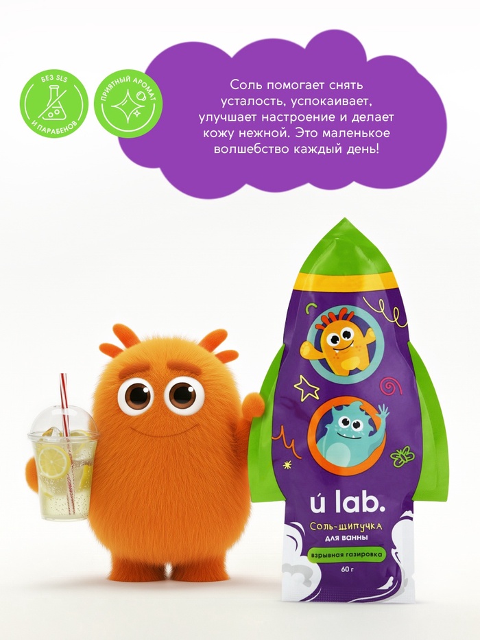 Соль для ванны «Монстрики», 60 г, аромат взрывная газировка, ULAB — Характеристики