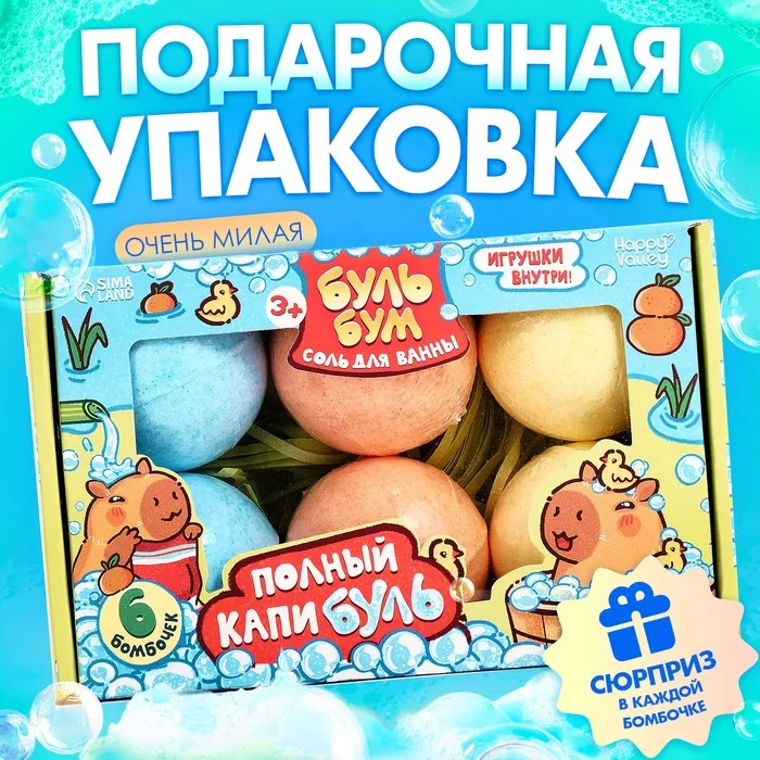 Набор из 6 бомбочек для ванны с игрушкой-сюрпризом станет отличным подарком для детей, которые любят расслабляться в воде. Каждая бомбочка не только превратит ванну в ароматный оазис, но и подарит мини-сюрприз в виде забавной капибары. Набор упакован в подарочную коробку, что делает его идеальным презентом для любого праздника.