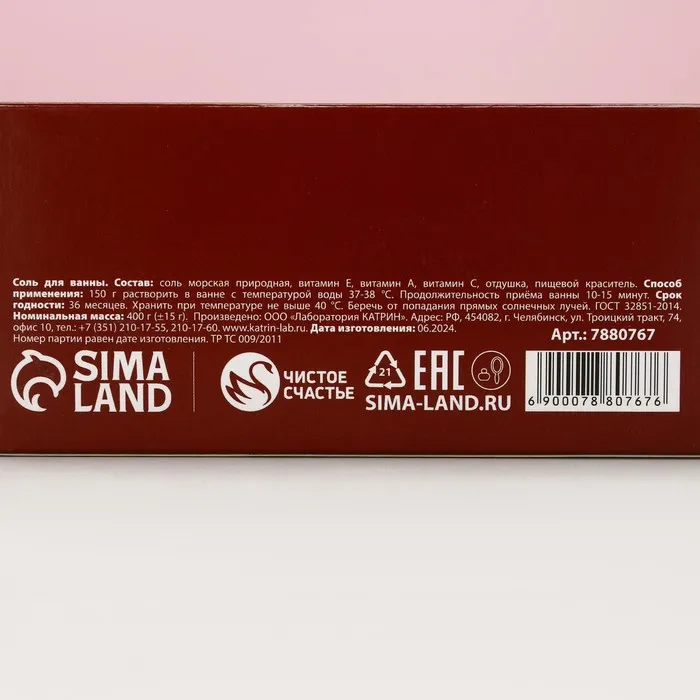 Состав: соль морская природная, витамин Е, витамин А, витамин С, отдушка, пищевой краситель.