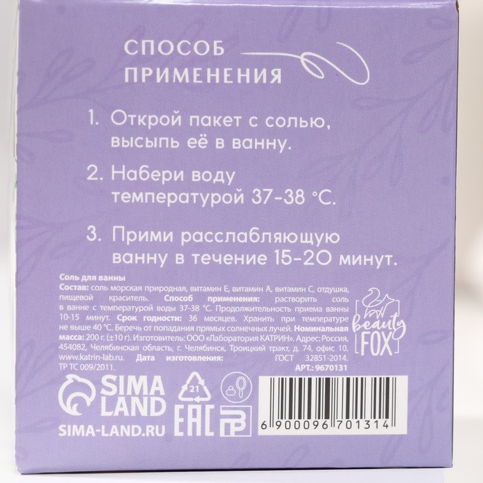 Соль для ванны «Утро в провансе», 200 г, аромат лаванды, BEAUTY FOX — Характеристики