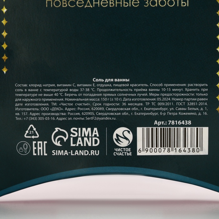 Соль для ванны «Верь в чудеса!», 150 г, аромат яблочного пирога, Чистое счастье — Характеристики