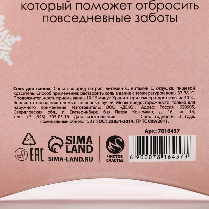 Соль для ванны «Верь в мечту!», 150 г, аромат ягодный, Чистое счастье — Характеристики