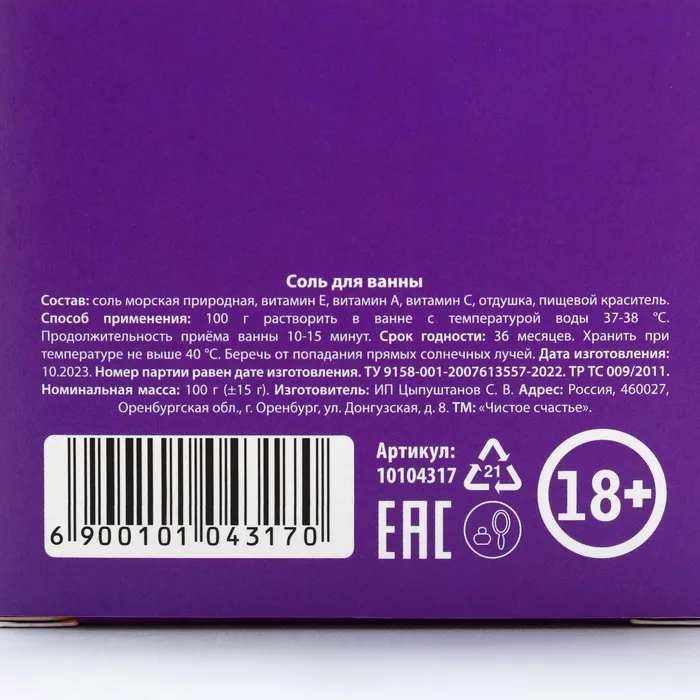 Соль для ванны «Возбудин», 100 г, аромат свежести, 18+, Чистое счастье — Характеристики