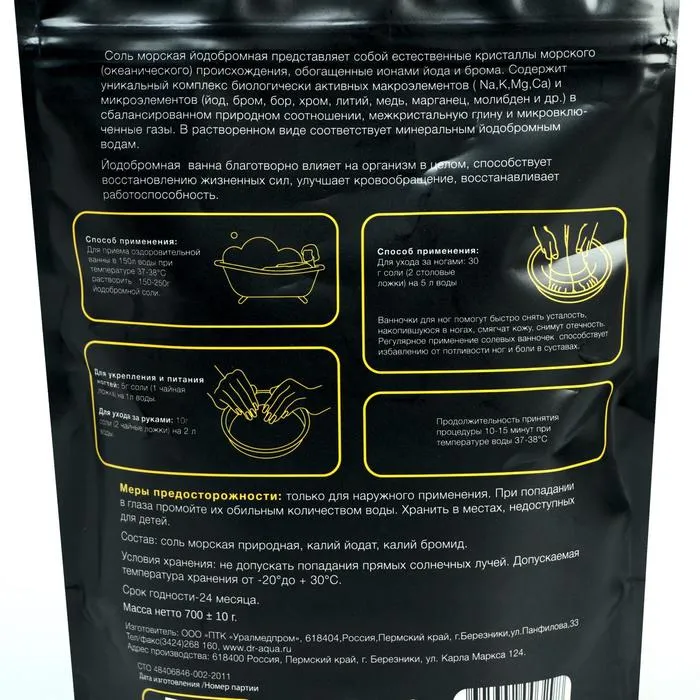 Соль морская йодобромная представляет собой естественные кристаллы морского (океанического) происхождения, обогащенные ионами йода и брома. Содержит уникальный комплекс биологически активных макроэлементов (Na, K, Mg, Ca) и микроэлементов (йод, бром, бор, хром, литий, медь, марганец, молибден и др.) в сбалансированном природном соотношении, межкристальную глину и микровключенные газы. В растворенном виде соответствует водам Мирового океана.
