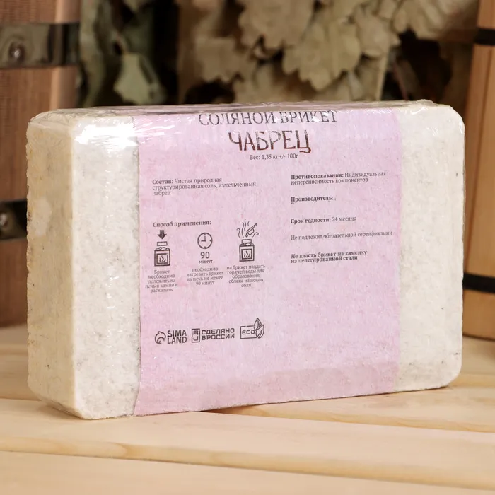 Применение: нагревайте брикет на печи не менее 90 минут, затем поддайте на него горячей воды. Соль наполнит воздух бани ионами, тем самым поможет снять усталость, улучшить кровообращение и общее самочувствие.