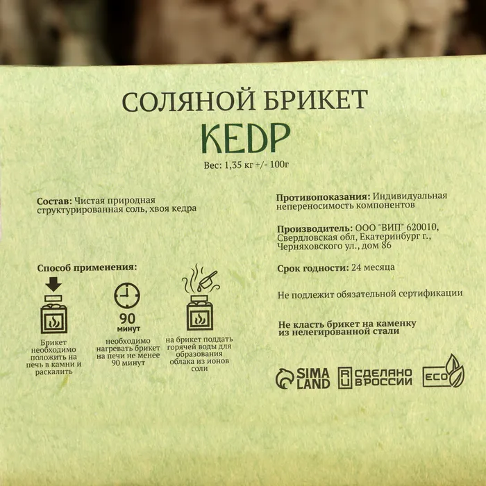 Применение: нагревайте брикет на печи не менее 90 минут, затем поддайте на него горячей воды. Соль наполнит воздух бани ионами, тем самым поможет снять усталость, улучшить кровообращение и общее самочувствие.