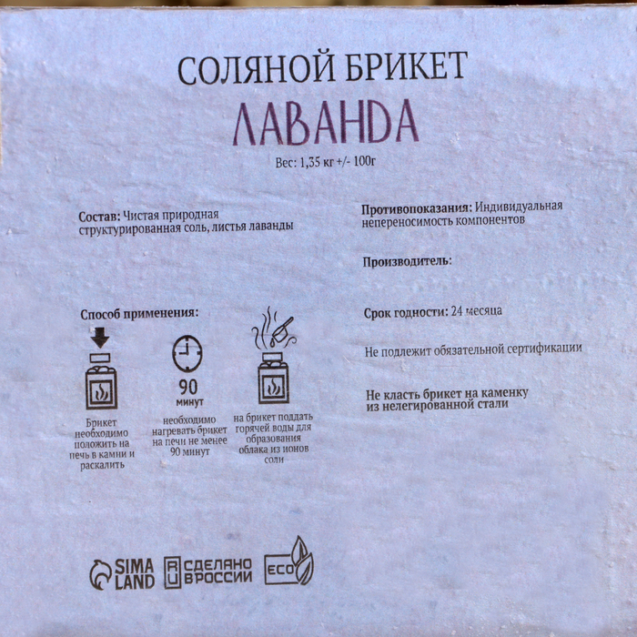 Соляной брикет "Лаванда" с алтайскими травами, 1,35 кг "Добропаровъ" — Характеристики