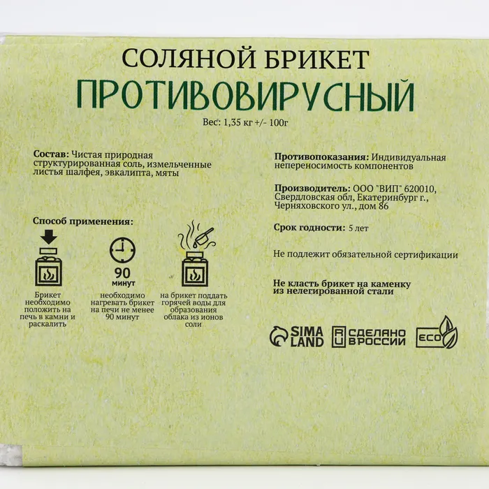 Соляной брикет "Противовирусный" эвкалипт, шалфей, мята 1,35 кг "Добропаровъ" — Характеристики