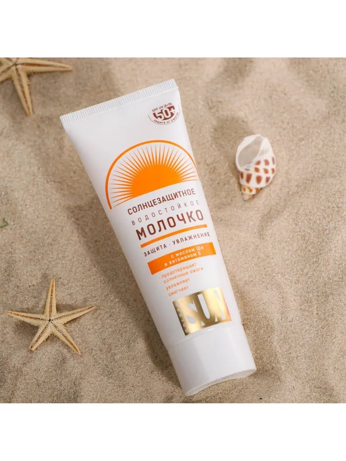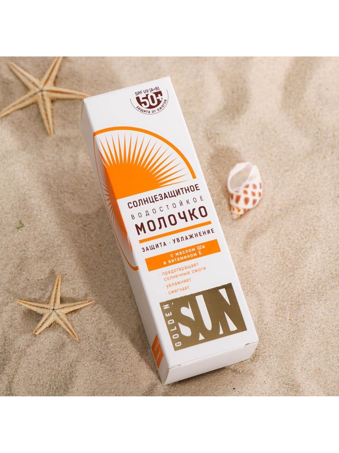 Солнцезащитное молочко "Golden Sun" SPF-50+ UV (А+В) водостойкое 60 мл. Молочко имеет нежную консистенцию, легко распределяется на коже, водостойкое.Содержит высокоэффективные фильтры UVA/UVB последнего поколения, которые предупреждают появление солнечных ожогов и преждевременное фотостарение кожи.В состав молочка включен увлажняющий и успокаивающий комплекс на базе масла Ши и витамин Е, обладающий мощным антиоксидантным действием.