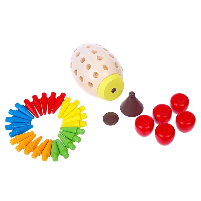 - Набор включает 33 элемента: детали ёжика (туловище, голову, носик), цветные иголки и яблоки для счёта.