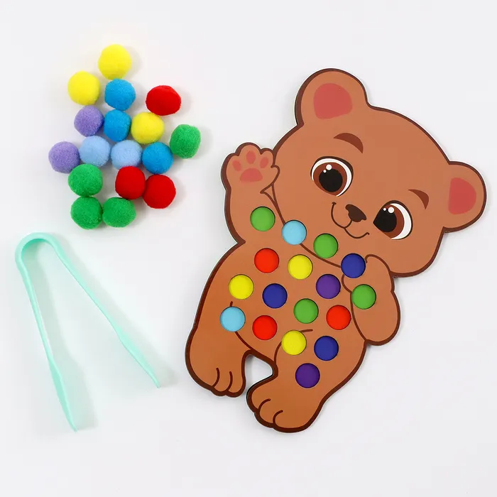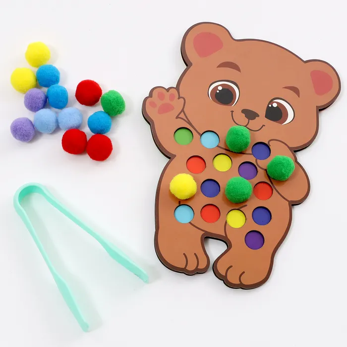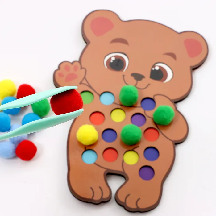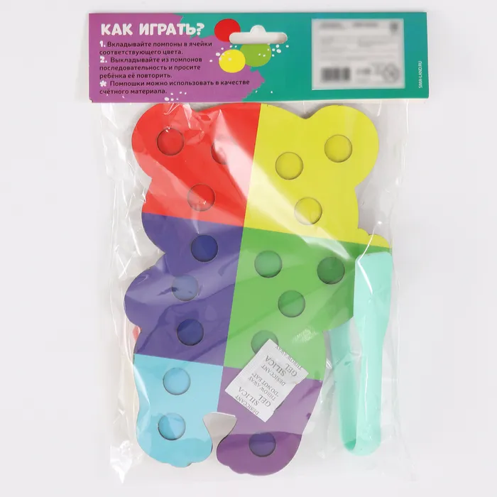 Сортер предлагает несколько вариантов игры. Попросите ребёнка рассортировать помпоны по цветам или используйте их как счётный материал. Пинцет помогает развивать точность движений и ловкость. Игра становится не только развлечением, но и полезным занятием, которое готовит малыша к новым открытиям.