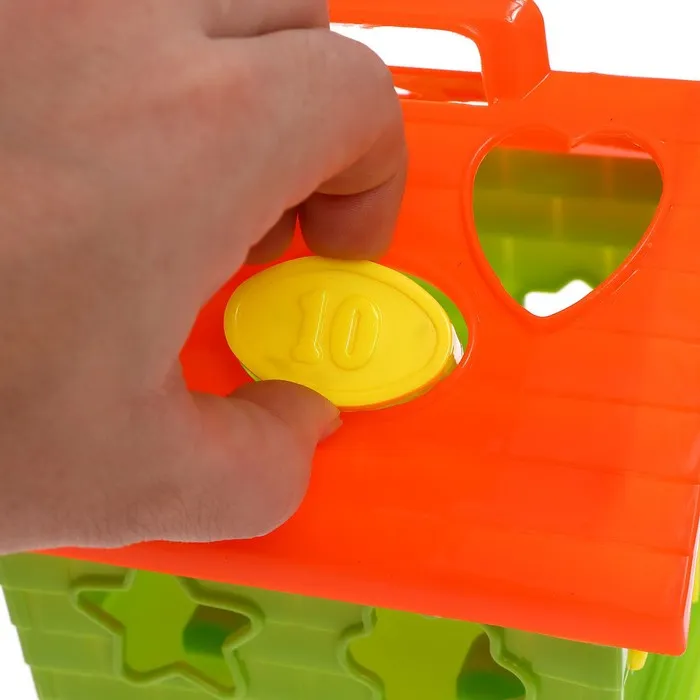 - Детали сортера — пронумерованные фигурки, а сам сортер выполнен в виде дома на подвижных колёсах.