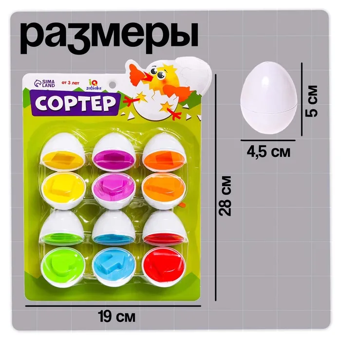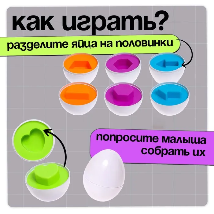Набор представляет собой 12 разноцветных деталей-половинок яиц. Задача ребёнка — к каждой половинке найти свою пару! Попросите кроху сортировать яйца по цветам.