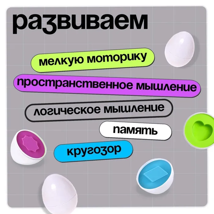 Игра способствует развитию мелкой моторики, пространственного и логического мышления, памяти и расширению кругозора. Яйца открываются легко, выполнены из пластика.