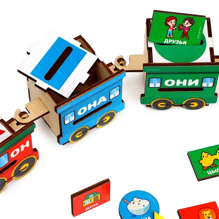 - Поиграйте с самим паровозиком как с сортером: пусть малыш опускает фишки в соответствующий вагон, сначала ориентируясь только на цвет и форму. Затем объясните, что в красном вагончике все слова мужского рода, в синем — женского, в жёлтом — среднего, а в зелёном — слова во множественном числе.
