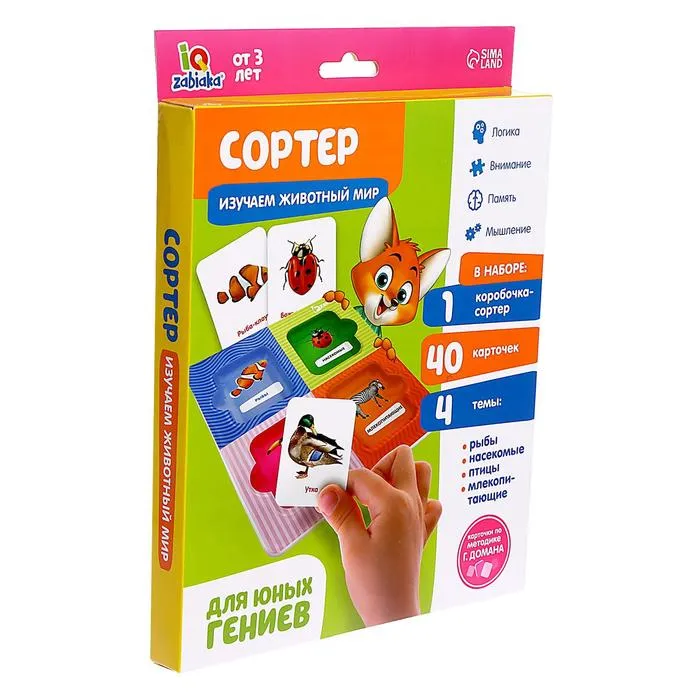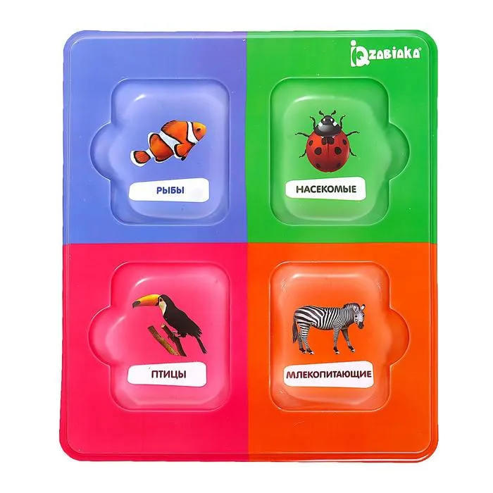 Игра с сортером «Изучаем животный мир» познакомит вашего кроху с миром добрых и весёлых зверюшек. Сортируйте карточки по специальной методике автора Г. Домана и знакомьте кроху с млекопитающими, рыбами, птицами и насекомыми.