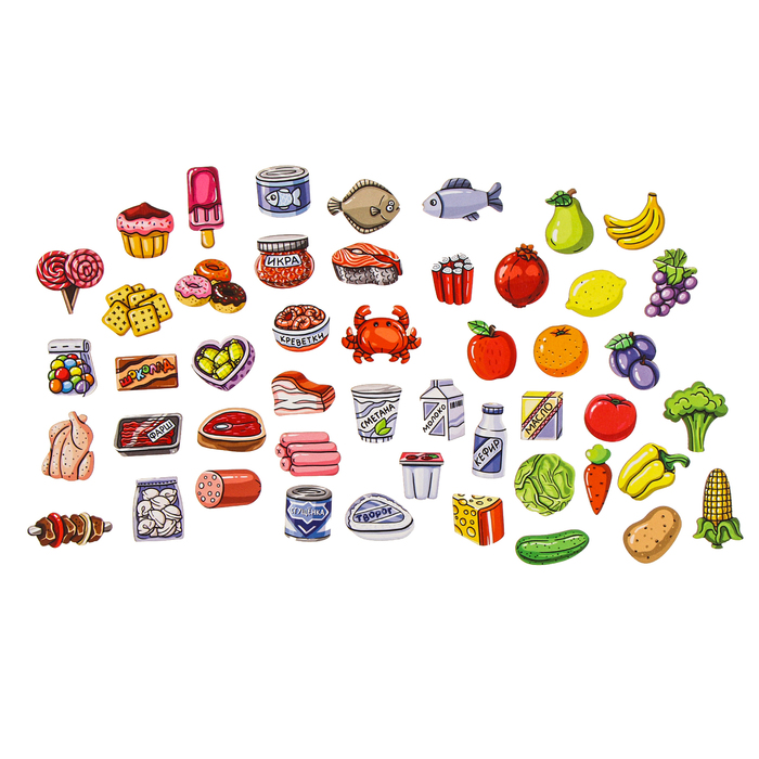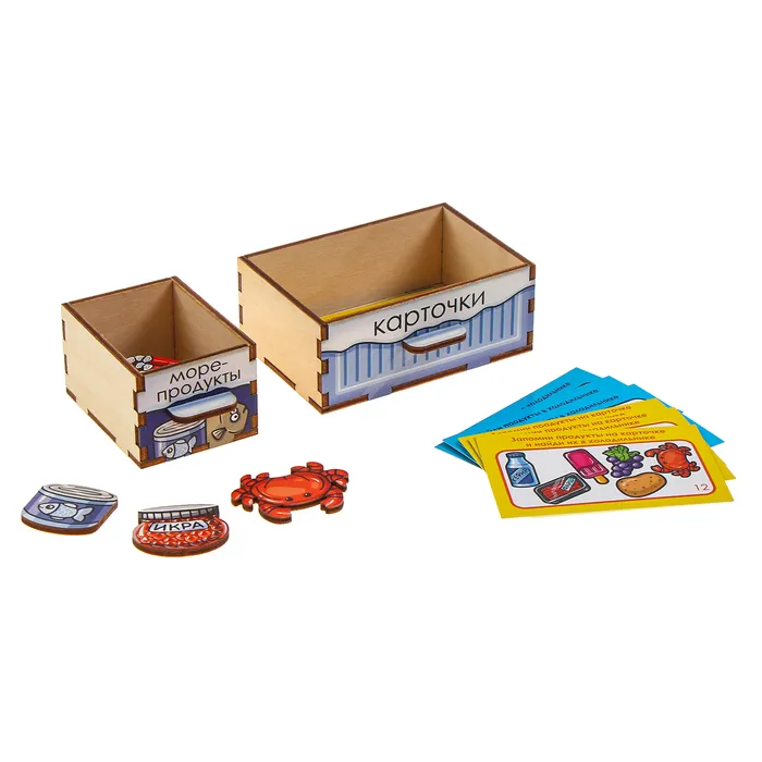 - «Закупка». Предложите ребёнку выбрать продукты согласно списку на карточке. Можно усложнить игру, попросив запомнить список перед выполнением задания.