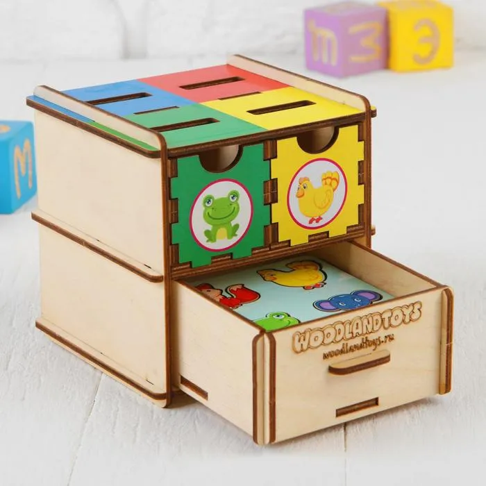 Деревянный комодик «Животные» — это увлекательная игра для детей от 3 лет, которая помогает изучать животных, цвета и развивать логическое мышление. В комплекте 16 фигурок животных, ящик для вкладышей и 4 ящика для сортировки.