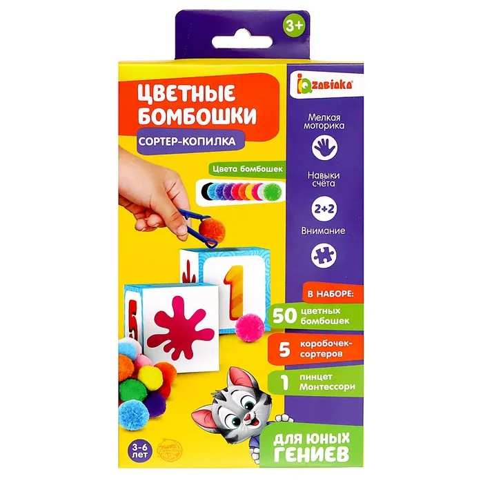 Сортер «Цветные бомбошки» подходит для занятий по методике Монтессори. С ним малыш быстро запомнит цвета и научится считать от 1 до 10. В комплект входит 50 ярких бомбошек, 5 кубиков-сортеров и пинцет для сортировки.