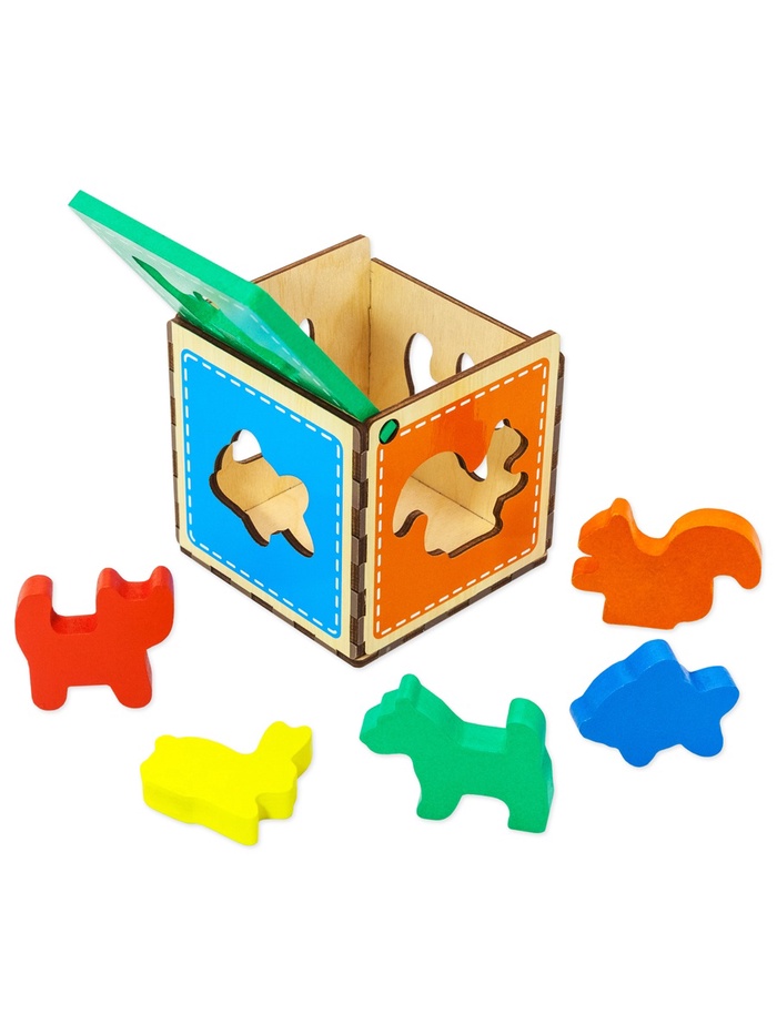 - Куб с вырезами для фигурок помогает ребёнку учиться сопоставлять формы и цвета.