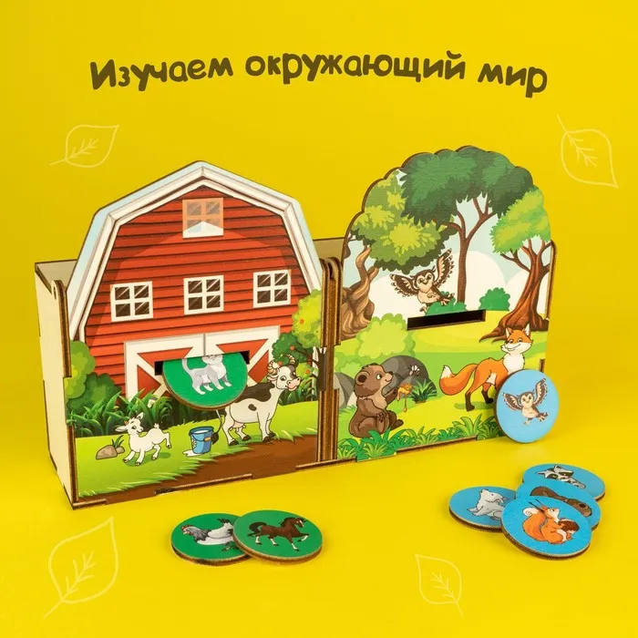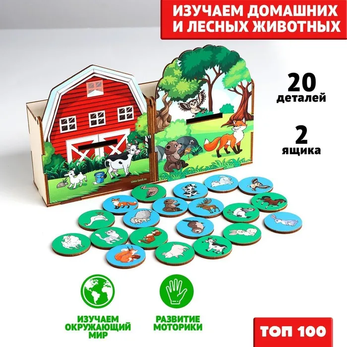 Деревянный сортер «Животные леса и фермы» — это увлекательная игра для детей от 3 лет, которая помогает изучать животных, развивать моторику и кругозор. В комплекте 20 элементов, включая фигурки животных, которые нужно расселить по своим домикам.