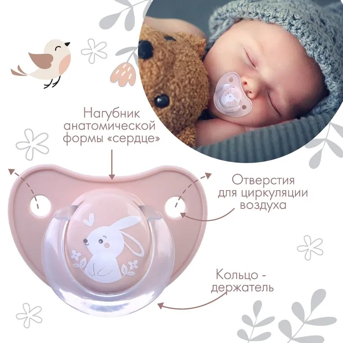 Отверстия нагубника обеспечивают свободную циркуляцию воздуха, предотвращают намокание и появление раздражения на нежной детской коже. Пустышку удобно держать в руках благодаря кольцу, которое прекрасно подходит для цепочки с прищепкой .