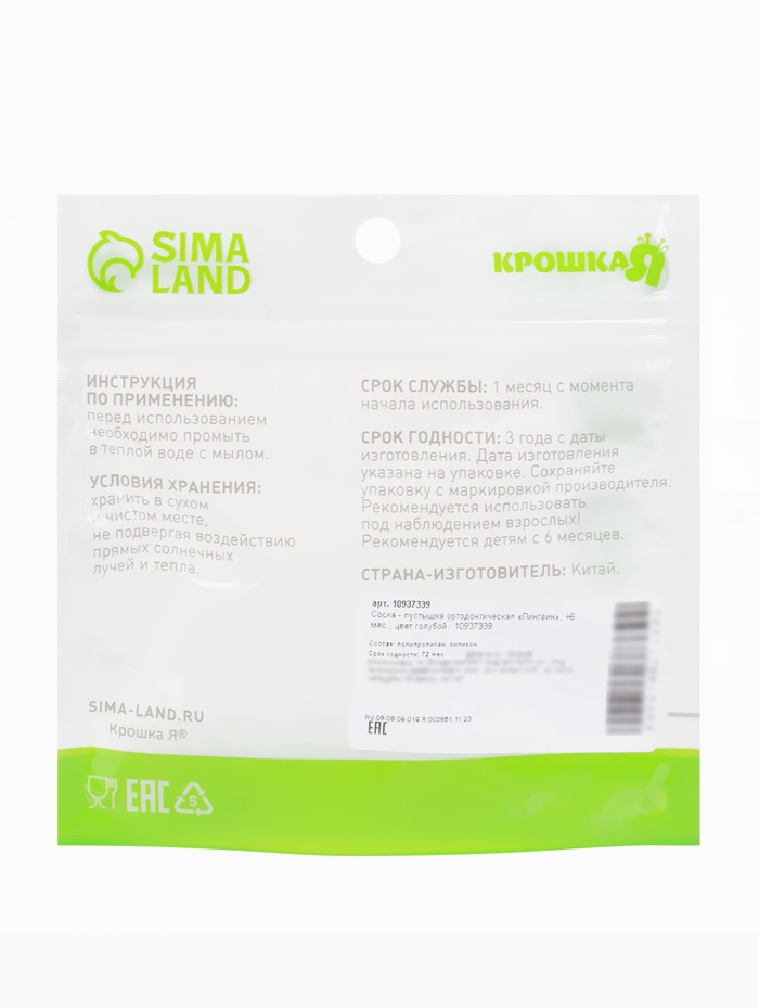 Соска - пустышка ортодонтическая «Пингвин», +6 мес., голубая — Характеристики