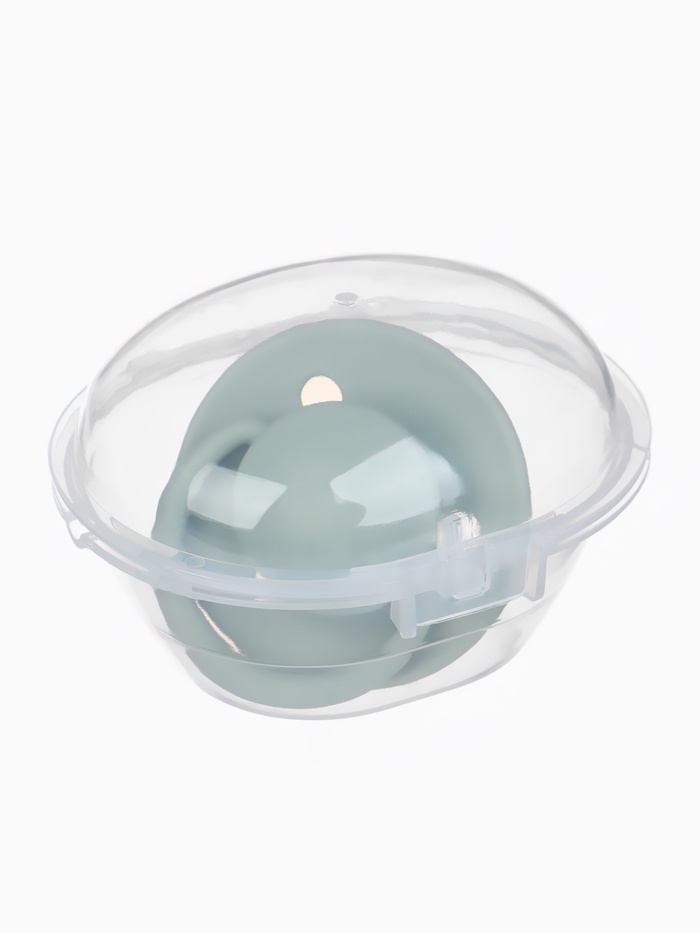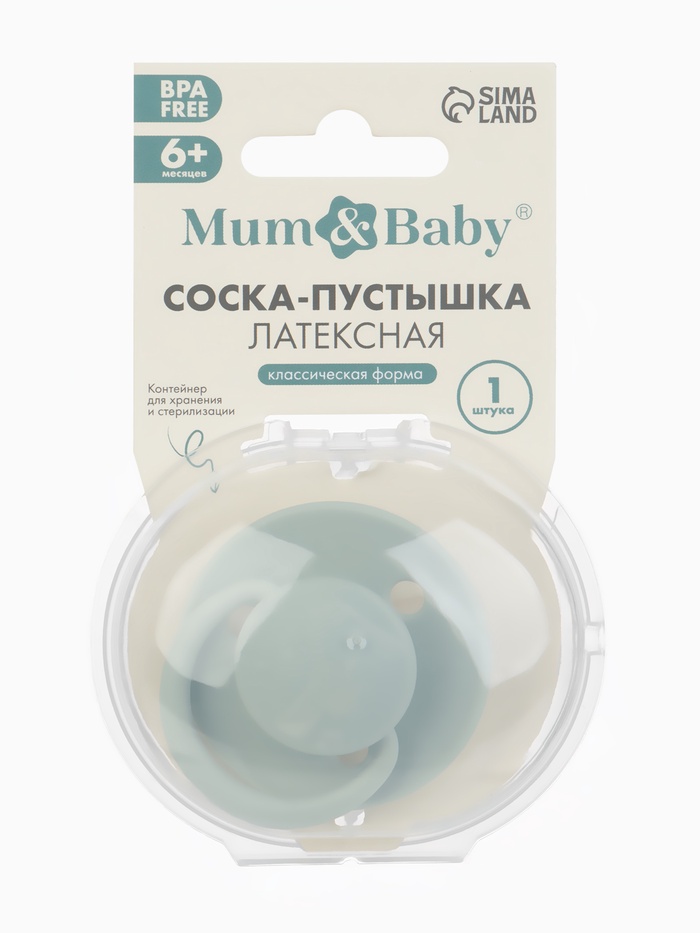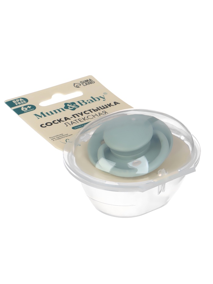 Соска-пустышка, от 6 мес., латекс, классическая, в контейнере, серо-зелёная, M&B — Характеристики