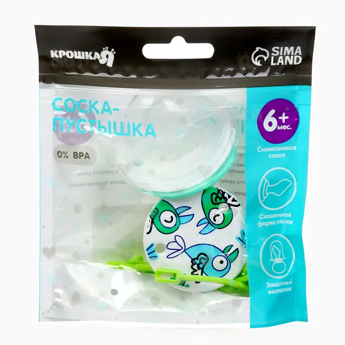 Соска - пустышка с держателем Крошка Я «Птички», ортодонтическая, от 6 мес, зеленый — Характеристики