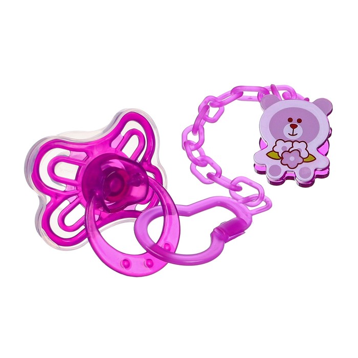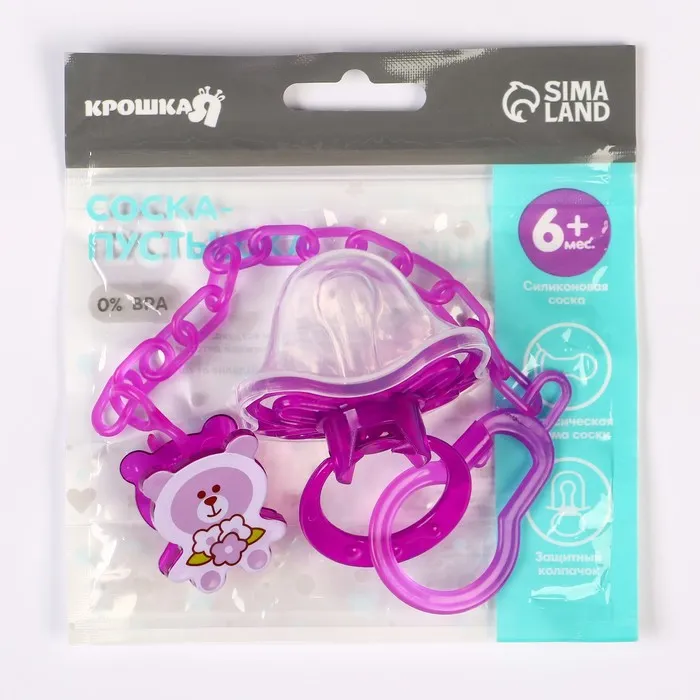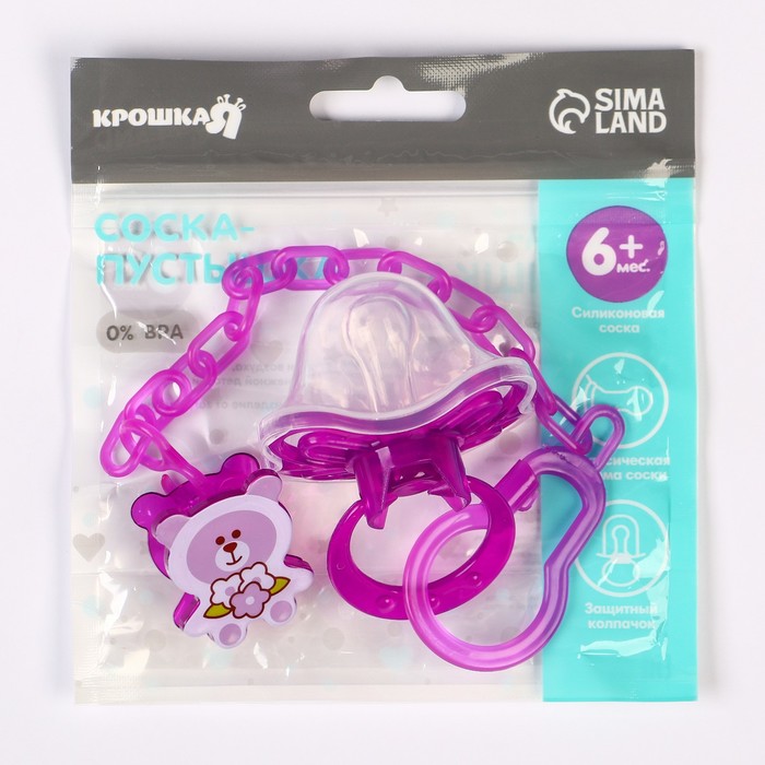 Соска - пустышка силиконовая классическая Крошка Я «Мишка», от 6 мес., с колпачком, держатель, фиолетовый