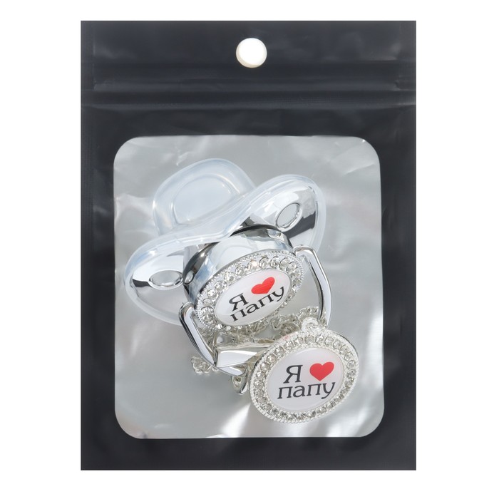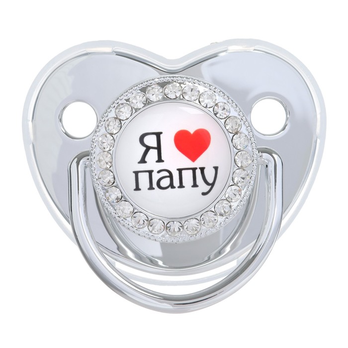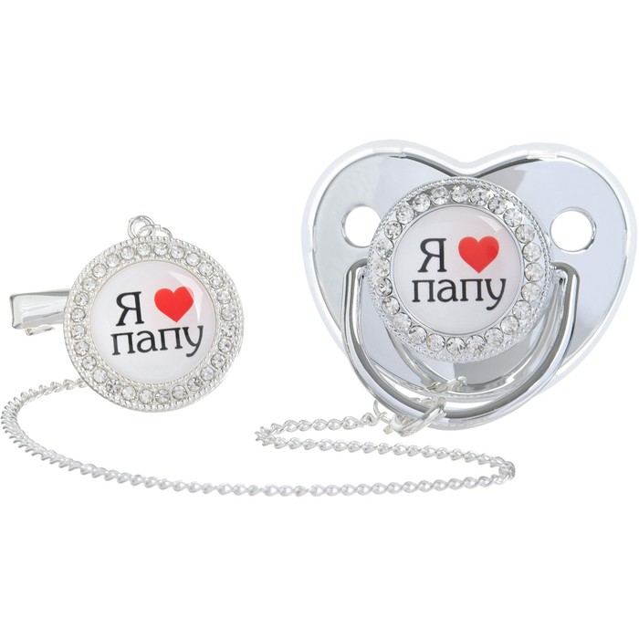 Соска - пустышка силиконовая ортодонтическая «Я люблю папу», от 6 мес., с колпачком + держатель - цепочка, цвет серебренный, стразы