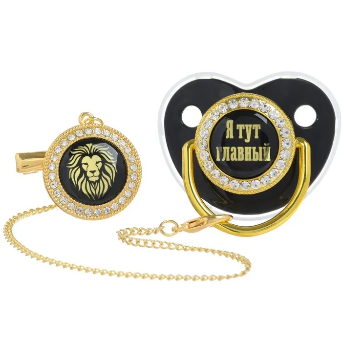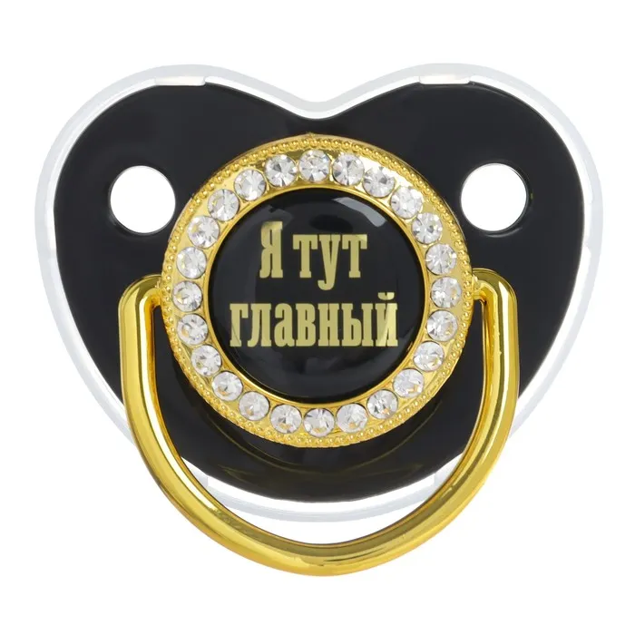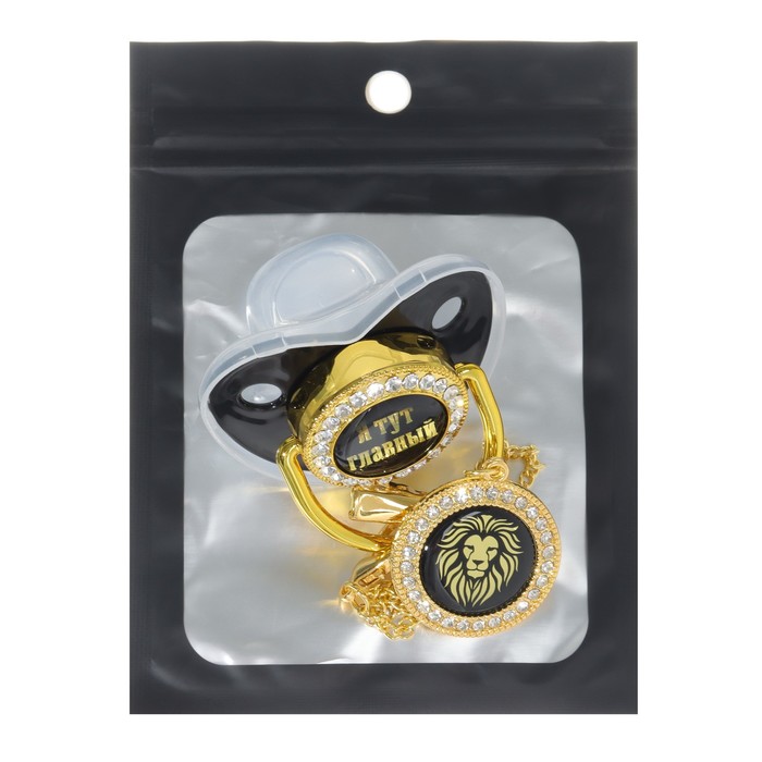 Соска - пустышка силиконовая ортодонтическая «Я тут главный», от 6 мес., с колпачком + держатель - цепочка, цвет черный/золото, стразы — Характеристики