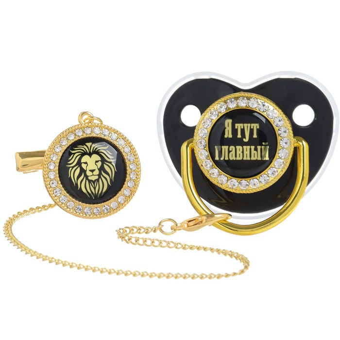 Соска - пустышка силиконовая ортодонтическая «Я тут главный», от 6 мес., с колпачком + держатель - цепочка, цвет черный/золото, стразы