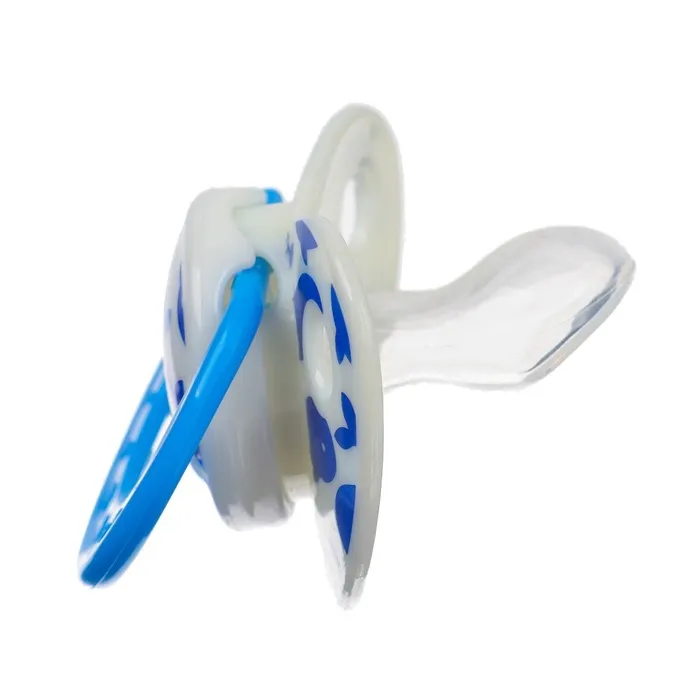 Соска пустышки силиконовая и имеет анатомическую форму диска, специальные вентиляционные отверстия на пустышке улучшают циркуляцию воздуха не раздражают кожу малыша и не оставляют следов и опрелостей. Создана для удовлетворения естественного сосательного рефлекса малышей. Пустышка анатомической формы имеет немного сплюснутый сосок, благодаря чему прилегает к языку.