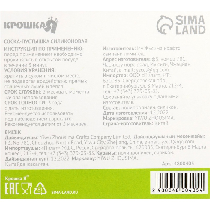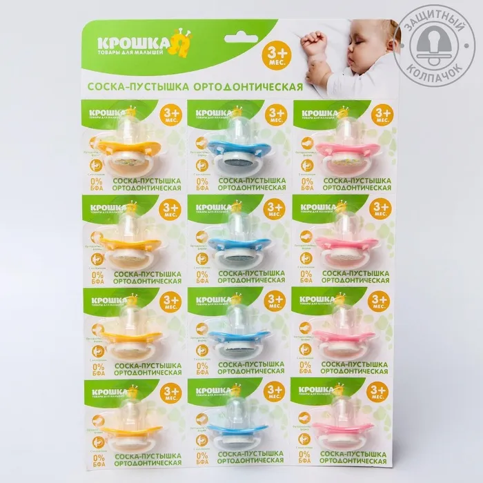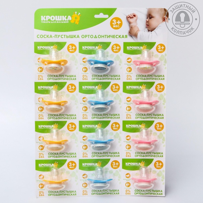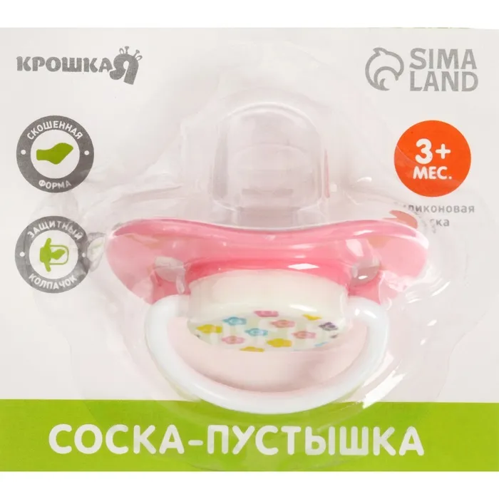 Соска - пустышка силиконовая ортодонтическая Крошка Я, от 3 мес., с колпачком, цвет МИКС — Характеристики