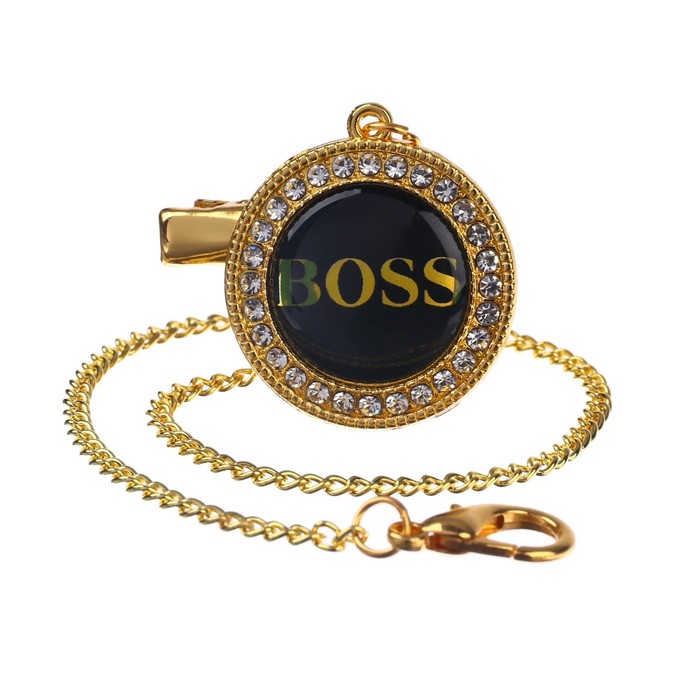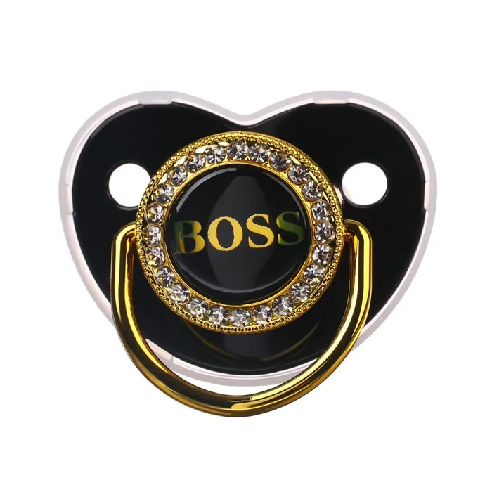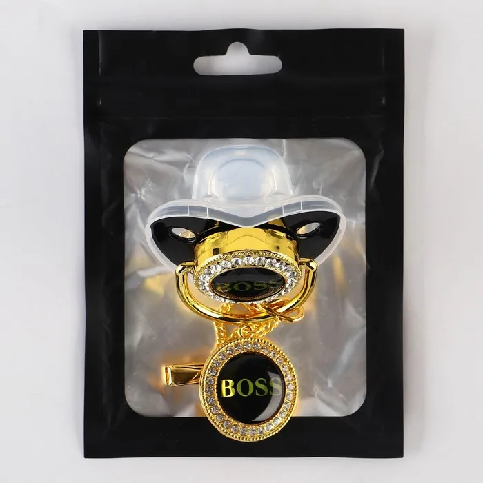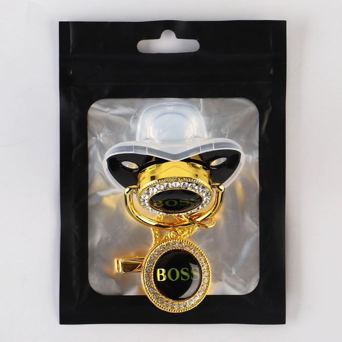Соска - пустышка силиконовая ортодонтическая M&B «BOSS», от 6 мес., с колпачком, держатель - цепочка, черный/золото, стразы