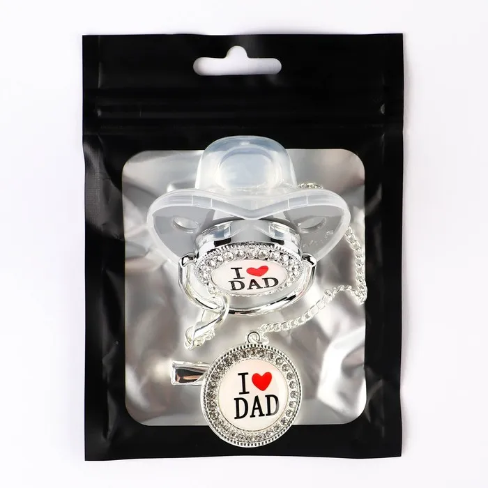 Соска - пустышка силиконовая ортодонтическая M&B «I LOVE DAD», от 6 мес., с колпачком, держатель - цепочка, серый/серебро, стразы