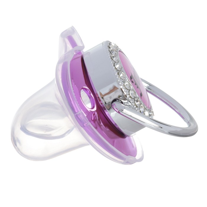 Роскошная пустышка со стразами Соска со стразами ортодонтической формы скошенная. Современный и модный дизайн пустышки со стразами не оставит равнодушным никого из взрослых и детей. Очень стильная и модная детская соска повторяет форму соска материнской груди во время кормления. Даже детки с зубами могут пользоваться ей, ведь она очень плотная.