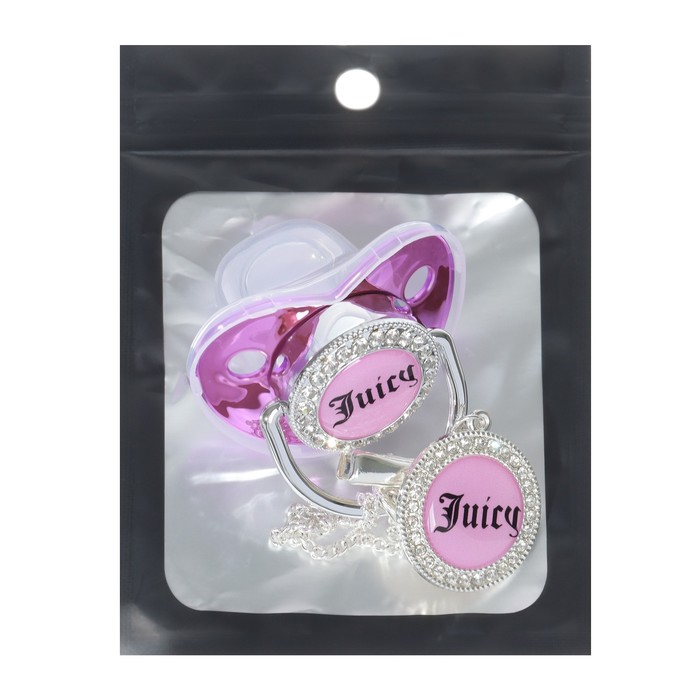 Соска - пустышка силиконовая ортодонтическая M&B «JUICY», от 6 мес., с колпачком, держатель - цепочка, розовый/серебло, стразы