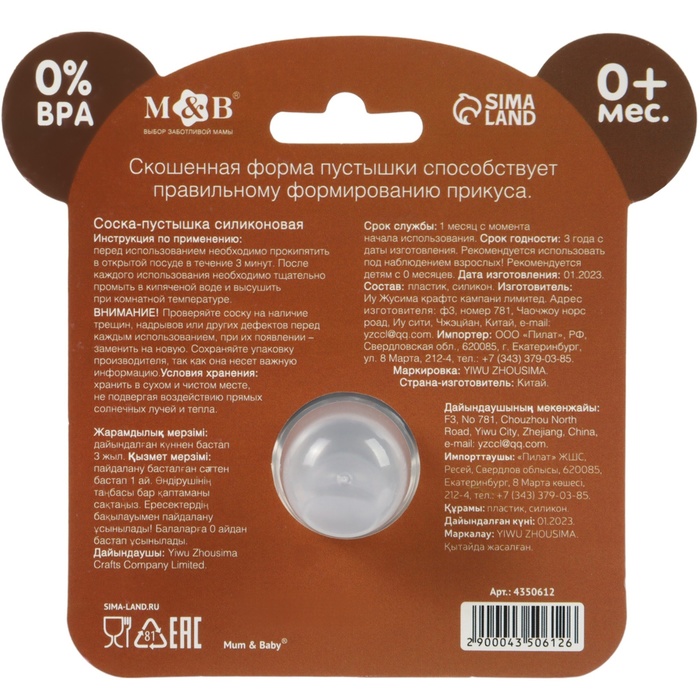 Форма соски: Ортодонтическая