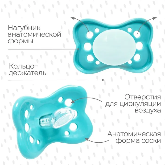Соска пустышки силиконовая и имеет анатомическую форму диска, специальные вентиляционные отверстия на пустышке улучшают циркуляцию воздуха не раздражают кожу малыша и не оставляют следов и опрелостей. Создана для удовлетворения естественного сосательного рефлекса малышей. Пустышка анатомической формы имеет немного сплюснутый сосок, благодаря чему прилегает к языку.