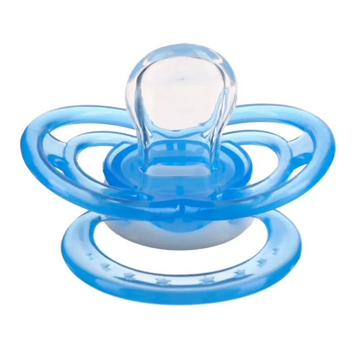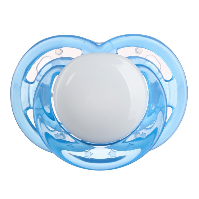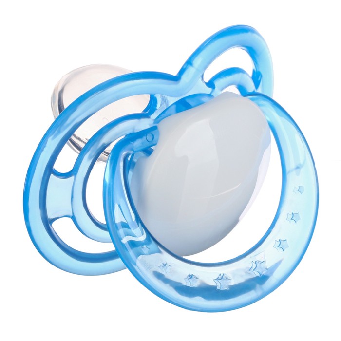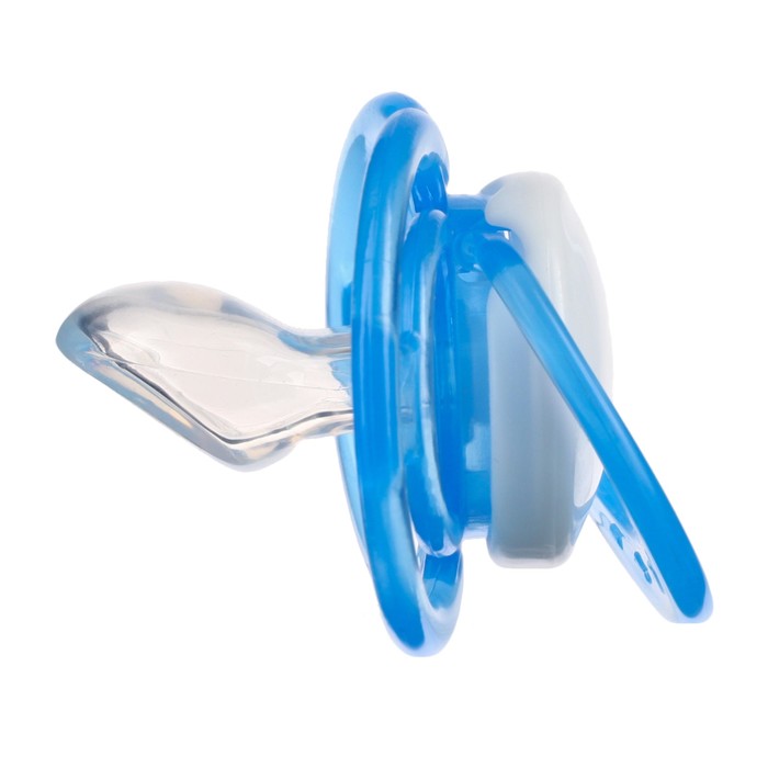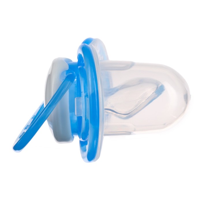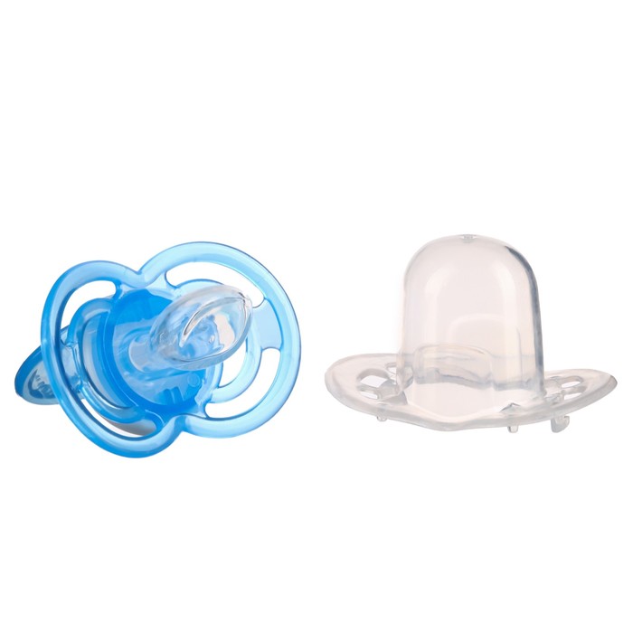 Соска - пустышка силиконовая ортодонтическая M&B, от 12 мес., с колпачком, голубой/белый — Характеристики